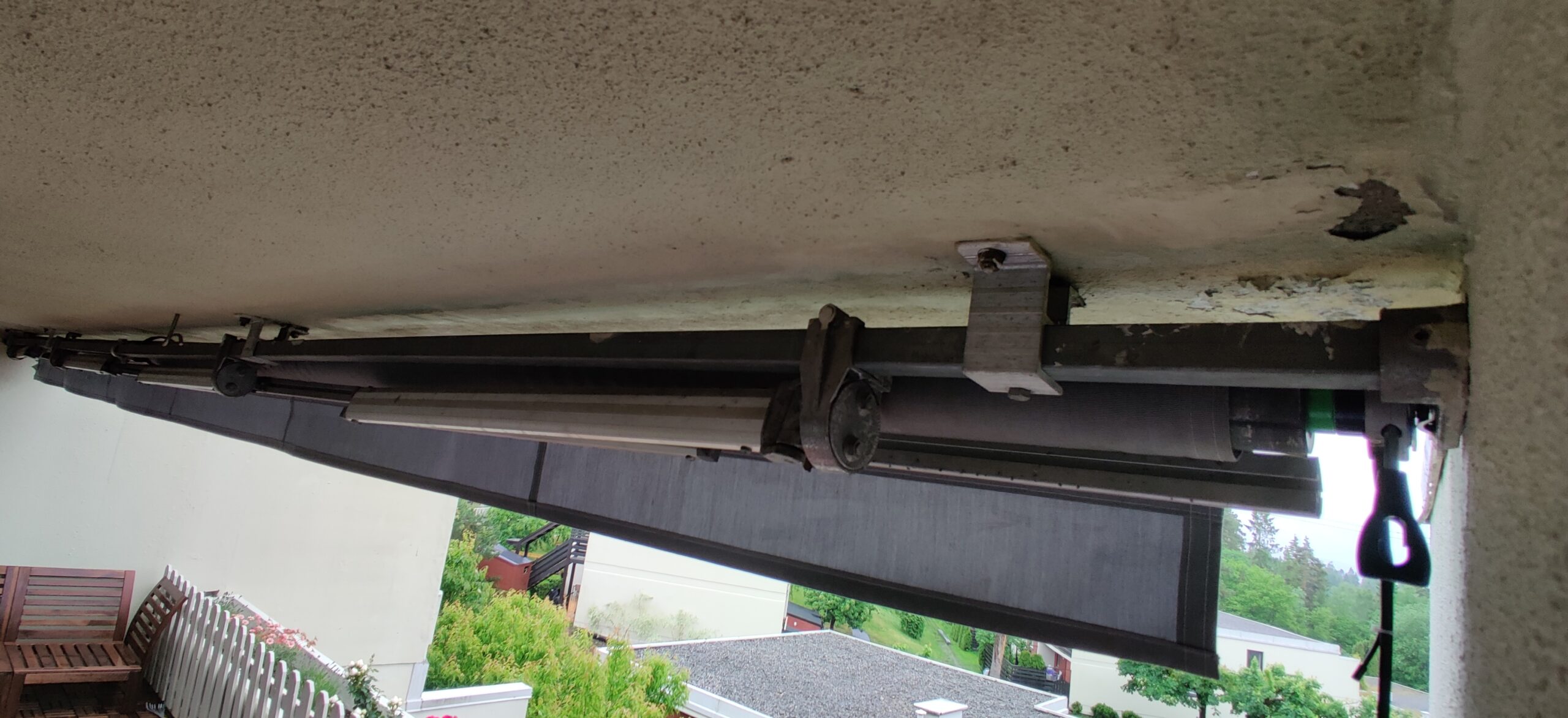 Installing the Dooya awning motor was a bit cumbersome, due to the sheer size of the awning. Our awning is 7 meters long, which means that it requires at least 3 persons to lift the unit off and on the roof. In total we needed 2 installation attempts. During the first attempt we managed to remove the old, manual crank system and slide the motor into the awning. After we slid in the motor we found that the manual crank system was wider than the new motor, which meant the motor could not be slid in completely whilst also being attached to the side plate supporting the awning: